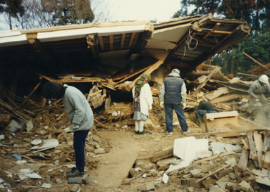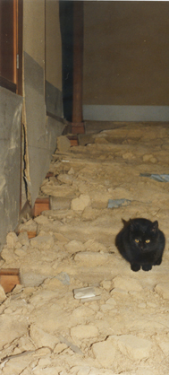 1995年1月17日の大地震で被害にあった、祖父・村野藤吾の自邸の写真です。もともと河内長野の農家を移築し、利用して建てたという旧館部分と、新しく増築した新館部分があったのですが、その旧館部分が言葉通りぺちゃんこになってしまいました。家族だけでなく、多くの方々に愛された家のこのような姿をお見せするのは心が痛みますが、地震の破壊力、そして自然の力を改めて感じていただけたら…と思います。祖父が生きていたらどんな言葉を語っただろう、そんな事を思いながら、写真を公表させて頂きます。 黒猫は震災直後どこからか現れ、倒壊した家の中に住み着いた迷い猫です。いつのまにか姿を消してしまいました。 |